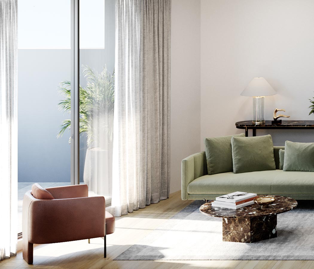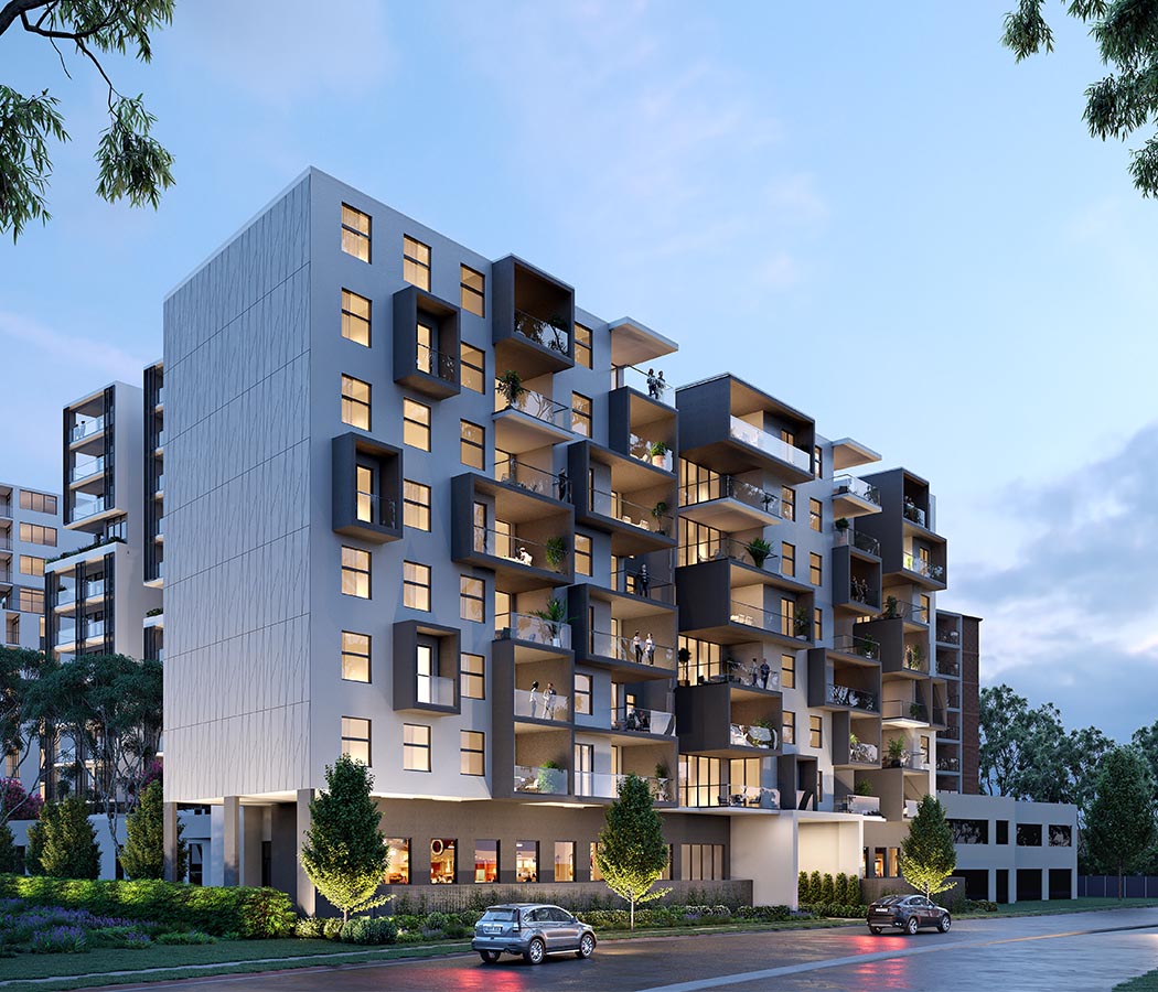 Ambient living spaces flow seamlessly to generous balconies or private courtyard gardens which provide an inviting environment for alfresco entertaining. The apartments command views from a variety of aspects, with many taking in vistas of Parramatta, the city skyline or the Blue Mountains to the west. Café and retail spaces at ground level bring life and vitality to the building.