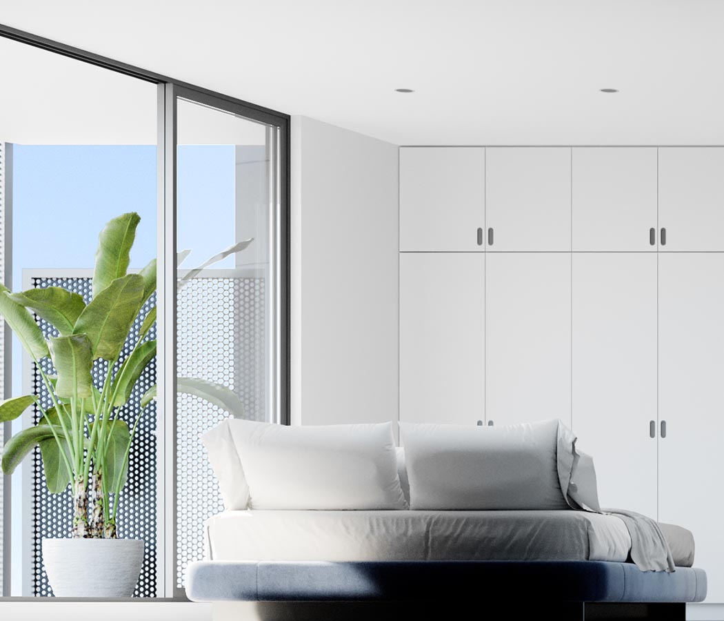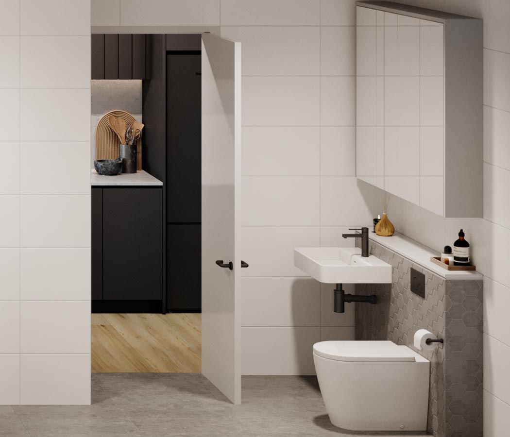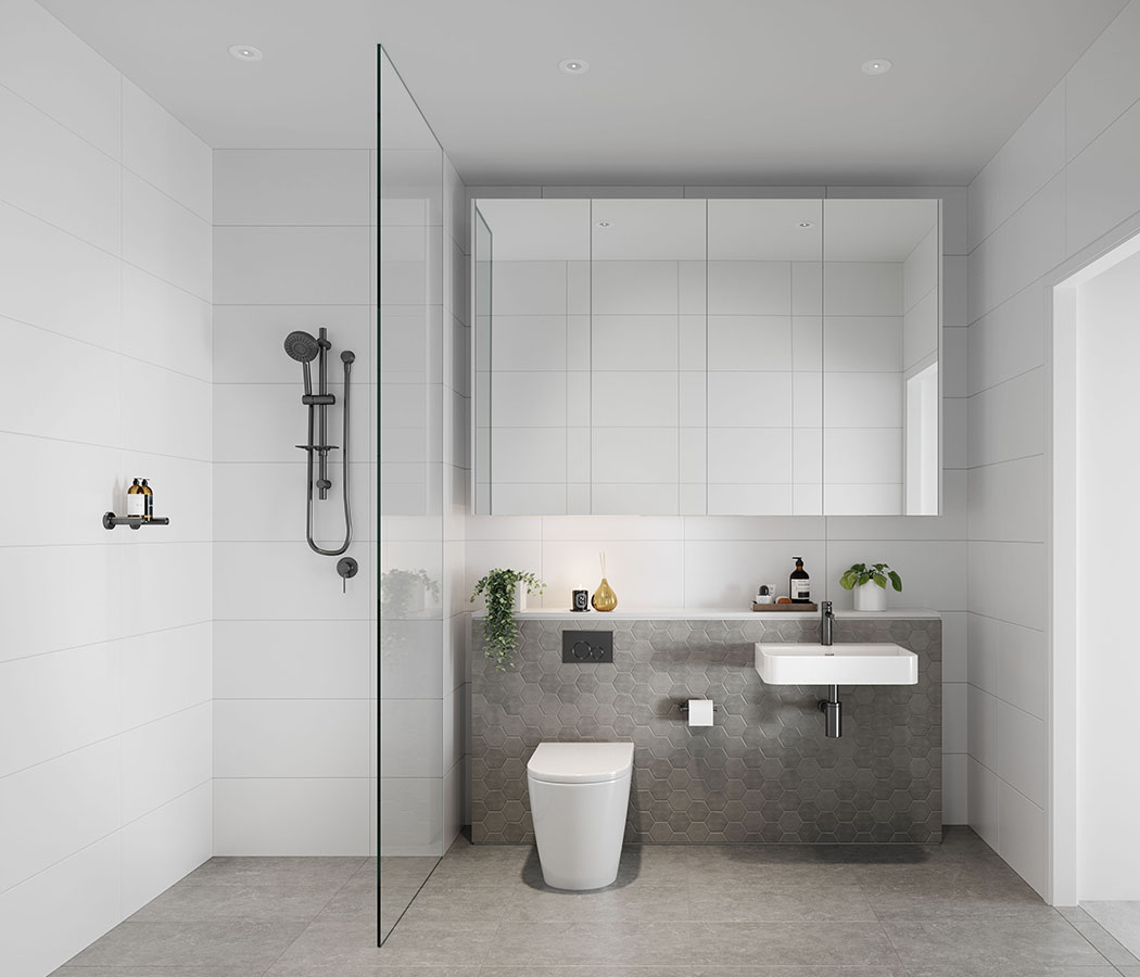 Timber floorboards, floor-to-ceiling glass and beautiful finishes create warm, inviting spaces where you’ll love to entertain. Bathrooms are a contrast of tones and textures, creating visually interesting spaces that are sleek and modern. Grey floor and vanity feature wall tiles are complemented by large-format white wall tiles for a thoroughly contemporary aesthetic, enhanced by wall-hung vanities and mirrored cabinetry.
